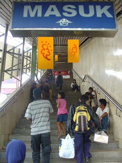 Tangga masuk (dan keluar) penumpang. Empat sampai lima banner berisi coretan penumpang KRL yang ikutan akan ditampilkan, menyambut pengguna stasiun..